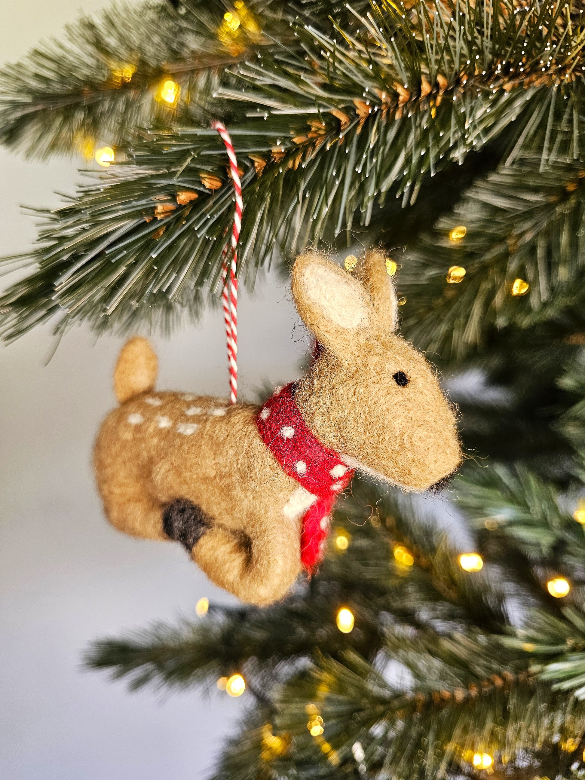 🔔 Let op: dit is een pre-order. Verzending vindt plaats in de week van 3 november 2025. Vilten hanger van een Hertje. Dit schattige hertje brengt warmte en magie in je kerstboom! Met haar rode sjaal met witte stipjes blijft ze heerlijk warm, zelfs op de koudste winterdagen.Â