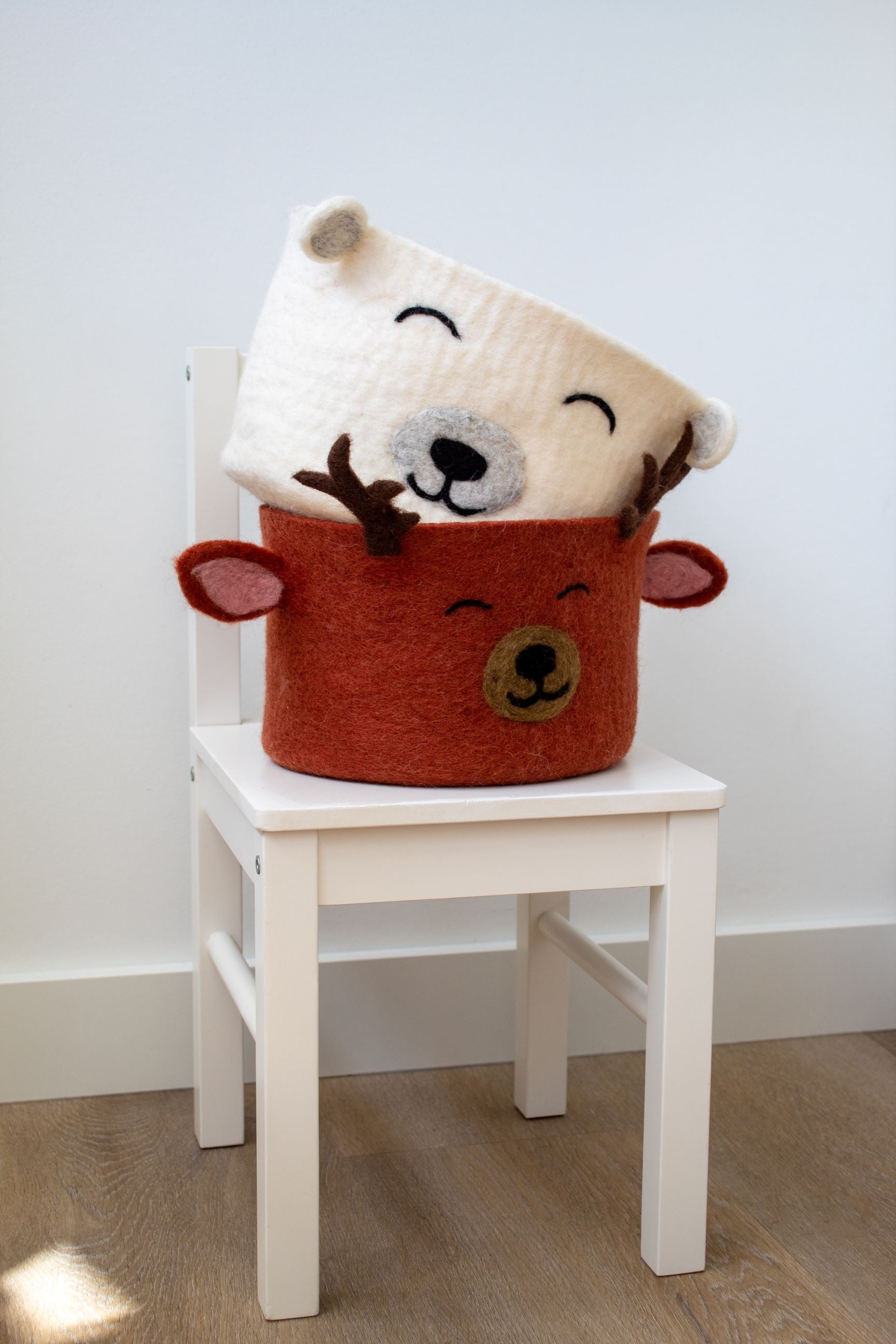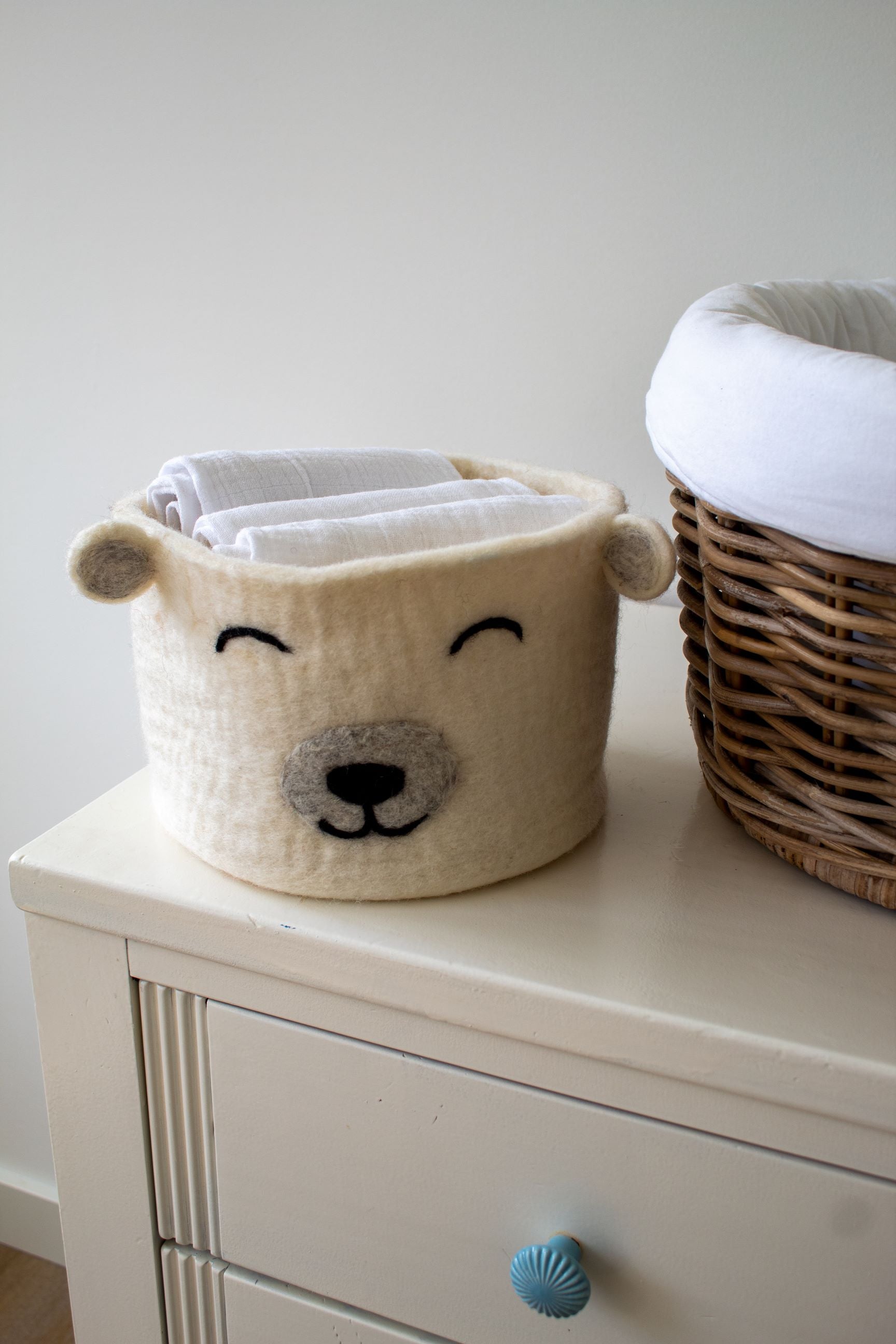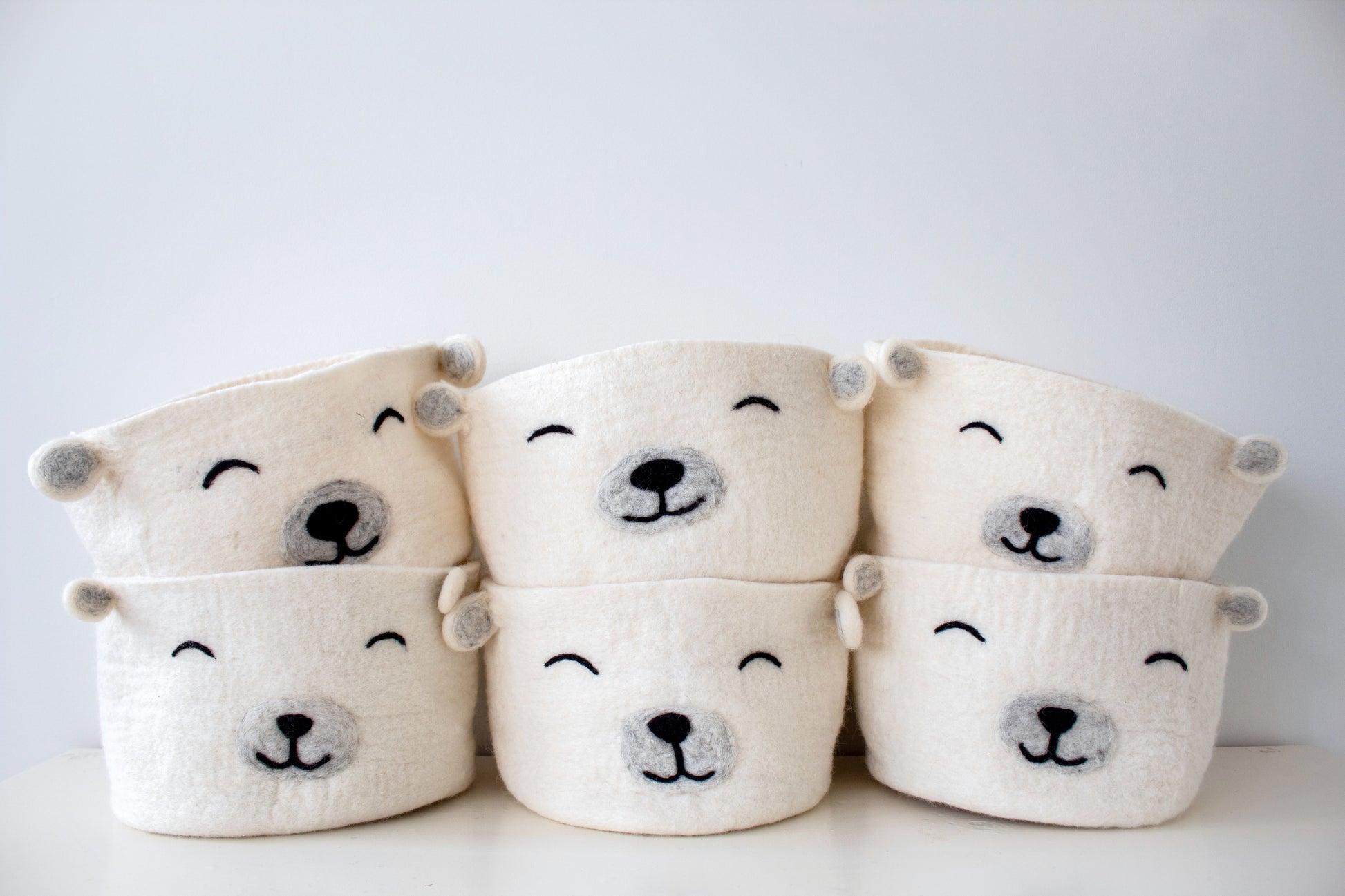 Dit handgemaakte vilten ijsberen mandje is ideaal als luiermandje of voor het opbergen van speelgoed. Ook leuk tijdens de feestdagen als winterse decoratie! Vul het met cadeautjes, lichtjes of kerstballen voor een feestelijke uitstraling.