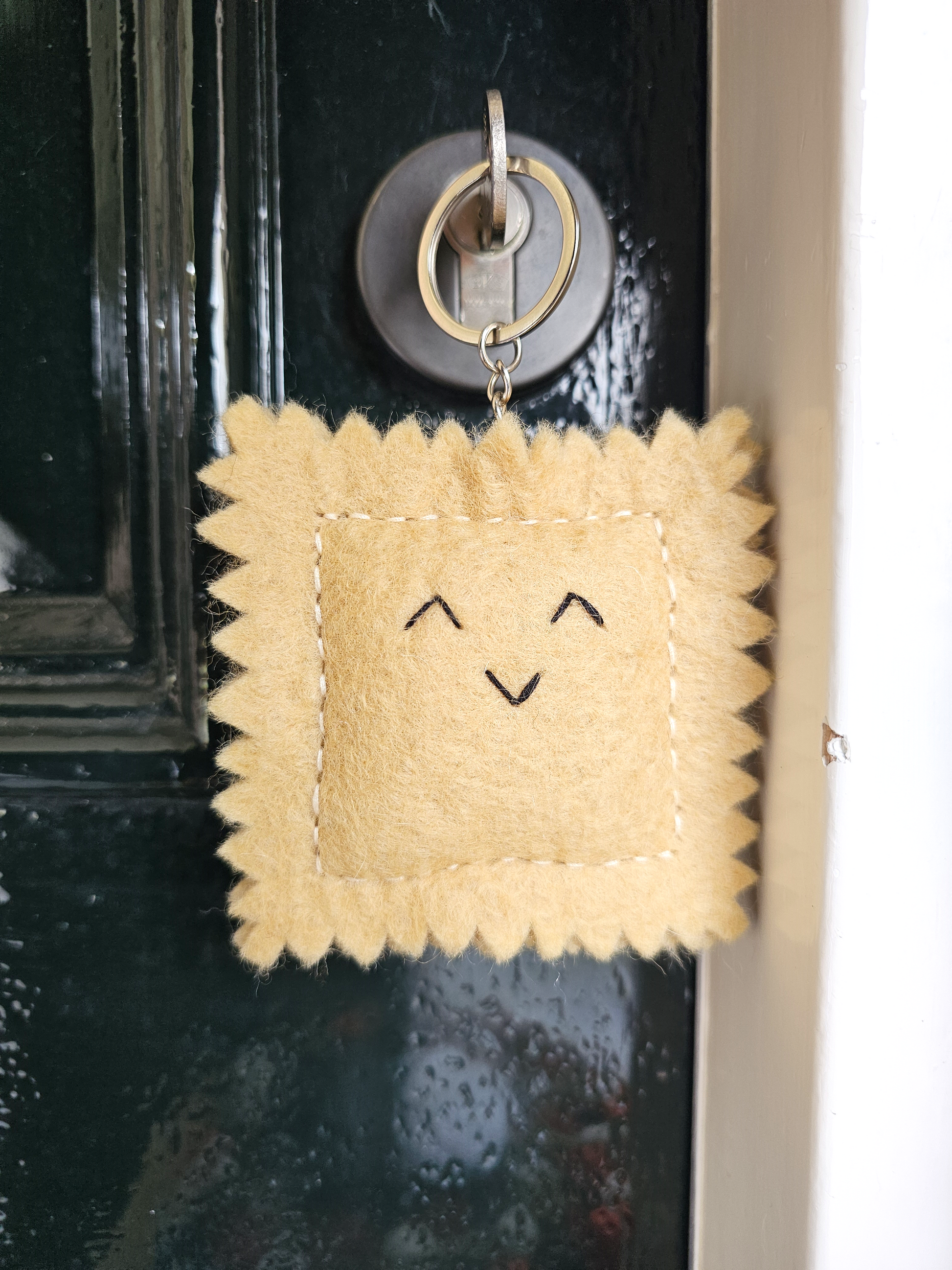 Sleutelhanger van een Ravioli. Leuk voor aan je (fiets)sleutel of tas! Handgemaakt van 100% schapenwol.