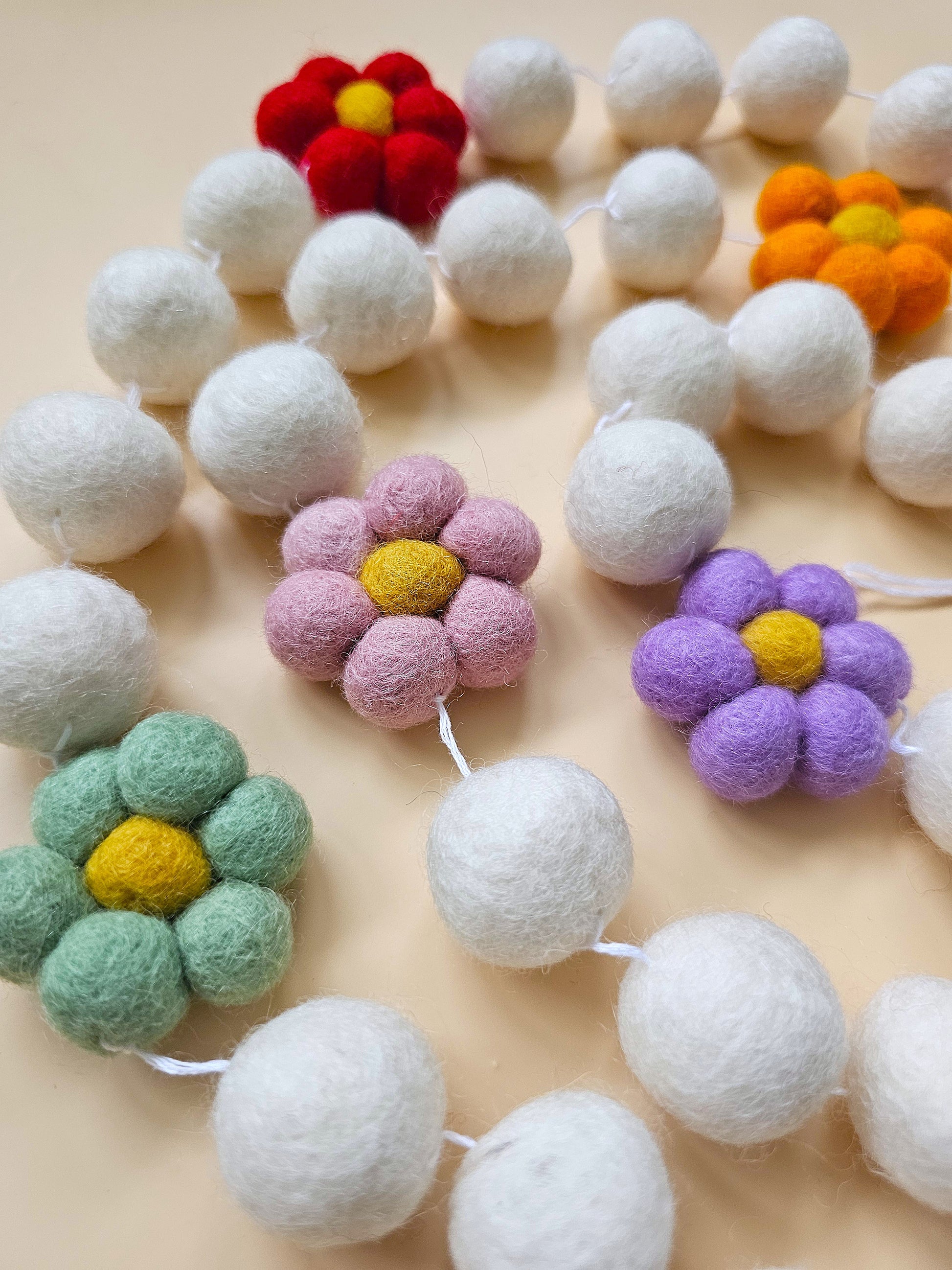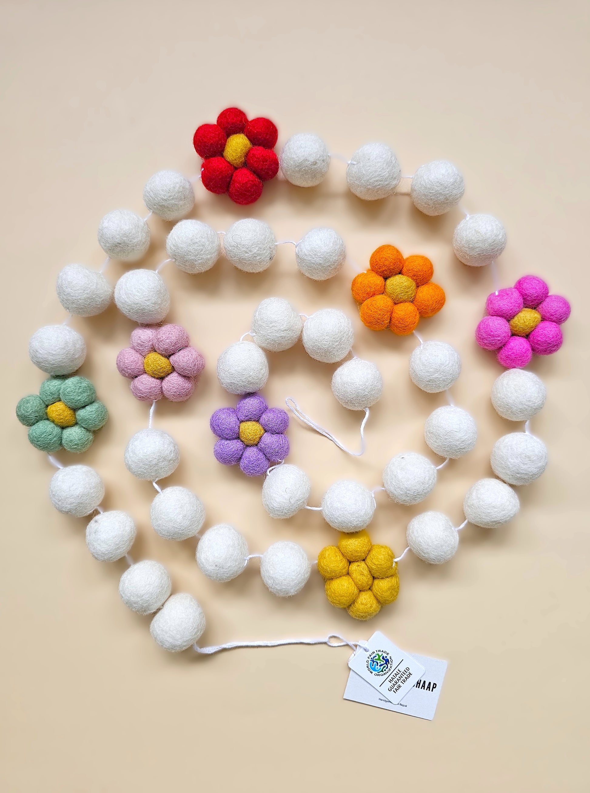 Fleur elke kamer op met deze handgemaakte vilten slinger vol kleurrijke bloemen en zachte bolletjes. De vrolijke kleuren en het zachte vilt maken ‘m tot een echte blikvanger – of hij nu in de kinderkamer hangt, boven de commode of in een gezellig speelhoekje.